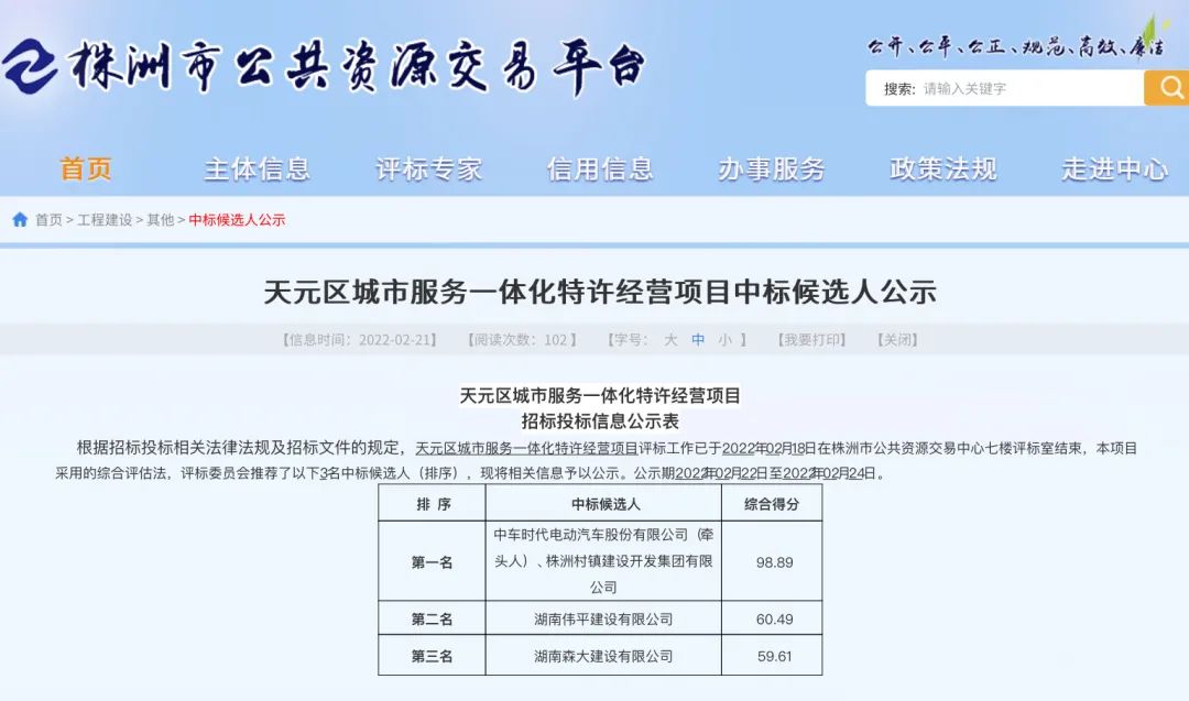 2月21日,株洲市公共資源交易平臺發(fā)布天元區(qū)城市服務(wù)一體化特許經(jīng)營項(xiàng)目的中標(biāo)候選人公示。中車時(shí)代電動汽車股份有限公司(牽頭人)、株洲村鎮(zhèn)建設(shè)開發(fā)集團(tuán)有限公司以98.89分的綜合得分奪得第一名。 來源 |環(huán)衛(wèi)科技網(wǎng)作者 | 王應(yīng)心 又一央企闖入城服市場! 2月21日,株洲市公共資源交易平臺發(fā)布天元區(qū)城...