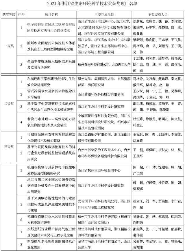 2021年浙江省生態(tài)環(huán)境科學(xué)技術(shù)獎(jiǎng)評(píng)選結(jié)果揭曉。省內(nèi)科研院所、高校、企事業(yè)等單位積極參評(píng),參評(píng)科研項(xiàng)目經(jīng)形式審查、集中評(píng)審、網(wǎng)上公示,最終15個(gè)項(xiàng)目獲2021年浙江省生態(tài)環(huán)境科學(xué)技術(shù)獎(jiǎng),其中一等獎(jiǎng)3項(xiàng),二等獎(jiǎng)4項(xiàng),三等獎(jiǎng)8項(xiàng)。 獲獎(jiǎng)項(xiàng)目是我省生態(tài)環(huán)境領(lǐng)域科技創(chuàng)新發(fā)展的成功范例,圍繞當(dāng)前生態(tài)環(huán)境遇到的...