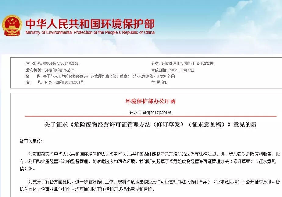 環(huán)境保護(hù)部公布的“關(guān)于征求《危險廢物經(jīng)營許可證管理辦法(修訂草案)(征求意見稿)》意見的函(環(huán)辦土壤函[2017]2001號),其中,第三十九條 以下危險廢物利用或者處置活動免于領(lǐng)取危險廢物經(jīng)營許可證:(一)產(chǎn)生危險廢物的單位在其廠區(qū)(場所)內(nèi),自行或者委托第三方專業(yè)機(jī)構(gòu)對本單位產(chǎn)生的危險廢物進(jìn)行利...