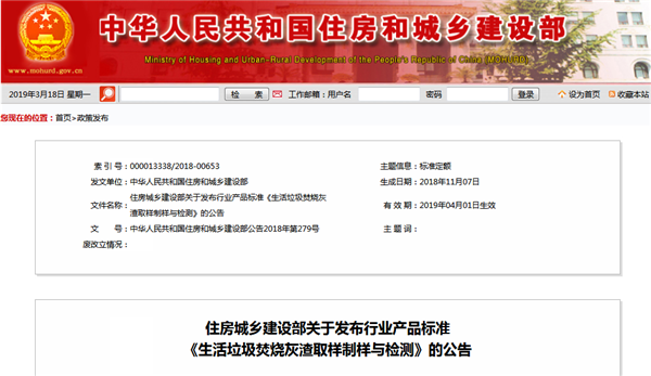 日前住房城鄉(xiāng)建設(shè)部發(fā)布了行業(yè)產(chǎn)品標(biāo)準(zhǔn)《生活垃圾焚燒灰渣取樣制樣與檢測》,編號為CJ/T531-2018,自2019年4月1日起實施。具體內(nèi)容如下:現(xiàn)批準(zhǔn)《生活垃圾焚燒灰渣取樣制樣與檢測》為城鎮(zhèn)建設(shè)行業(yè)產(chǎn)品標(biāo)準(zhǔn),編號為CJ/T531-2018,自2019年4月1日起實施。本標(biāo)準(zhǔn)在住房城鄉(xiāng)建設(shè)部門戶網(wǎng)站...