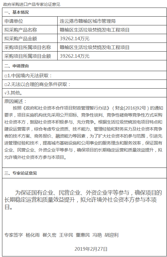 日前江蘇政府采購網(wǎng)發(fā)布了《贛榆區(qū)生活垃圾焚燒發(fā)電工程PPP項目境外社會資本采購專家論證》,論證意見為,按照《政府和社會資本合作項目財政管理暫行辦法》(財金[2016]92號)的通知要求,項目實施機(jī)構(gòu)優(yōu)先采用公開招標(biāo)、競爭性談判、競爭性磋商等競爭性方式采購社會資本方,鼓勵社會資本積極參與、充分競爭。根...
