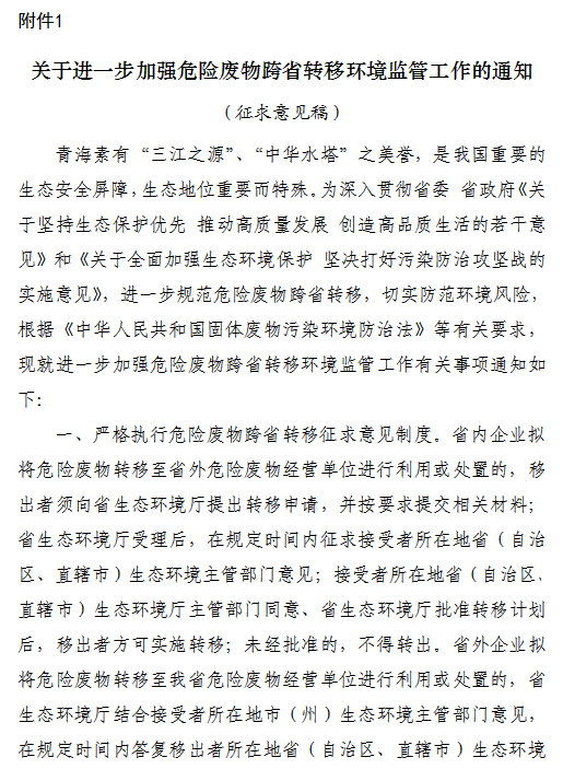 關(guān)于征求《關(guān)于進(jìn)一步加強(qiáng)危險廢物跨省轉(zhuǎn)移環(huán)境監(jiān)管工作的通知(征求意見稿)》意見建議的函各市(州)生態(tài)環(huán)境局,省固體廢物污染防治中心、省環(huán)境保護(hù)綜合行政執(zhí)法監(jiān)督局,相關(guān)危險廢物產(chǎn)生、經(jīng)營單位:為強(qiáng)化危險廢物跨省轉(zhuǎn)移環(huán)境監(jiān)管,切實防范環(huán)境風(fēng)險,青海省生態(tài)環(huán)境廳草擬了《關(guān)于進(jìn)一步加強(qiáng)危險廢物跨省轉(zhuǎn)移環(huán)境監(jiān)...