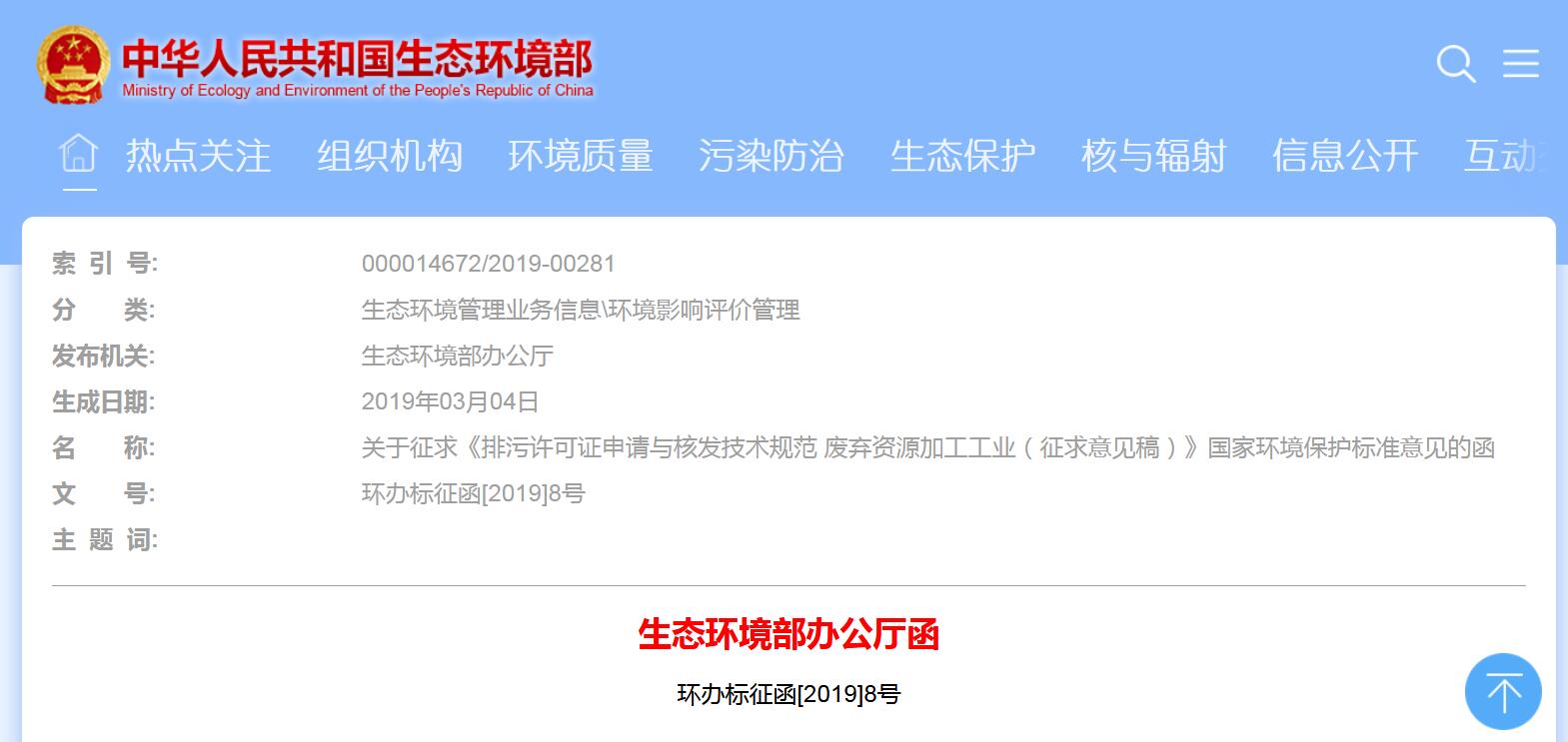 關(guān)于征求《排污許可證申請(qǐng)與核發(fā)技術(shù)規(guī)范 廢棄資源加工工業(yè)(征求意見(jiàn)稿)》國(guó)家環(huán)境保護(hù)標(biāo)準(zhǔn)意見(jiàn)的函生態(tài)環(huán)境部辦公廳函環(huán)辦標(biāo)征函[2019]8號(hào)關(guān)于征求《排污許可證申請(qǐng)與核發(fā)技術(shù)規(guī)范 廢棄資源加工工業(yè)(征求意見(jiàn)稿)》國(guó)家環(huán)境保護(hù)標(biāo)準(zhǔn)意見(jiàn)的函各有關(guān)單位:為落實(shí)《國(guó)務(wù)院辦公廳關(guān)于印發(fā)控制污染物排放許可制實(shí)施...