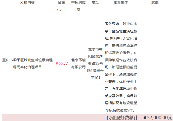 重慶市梁平區(qū)城北生活垃圾填埋場無害化治理項目(19C0015)結(jié)果公告發(fā)布日期: 2019年2月1日一、項目號:19C0015二、項目名稱:重慶市梁平區(qū)城北生活垃圾填埋場無害化治理項目三、采購方式:公開招標(biāo)四、評審日期: 2019年1月31日五、公告日期: 2019年2月1日六、中標(biāo)結(jié)果分包號:1七...
