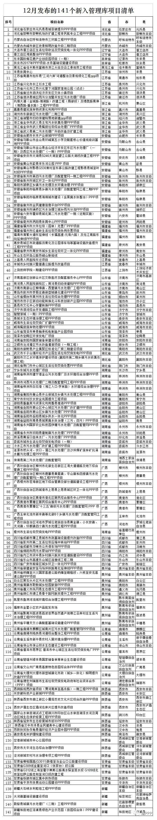 財(cái)政部PPP中心發(fā)布2018年12月141個(gè)新入管理庫(kù)項(xiàng)目清單,涉及多個(gè)環(huán)保項(xiàng)目。詳情如下: