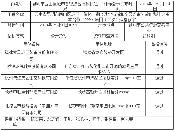 云南省昆明市西山區(qū)環(huán)衛(wèi)一體化二期(涉農(nóng)街道和全區(qū)河道)政府和社會資本合作(PPP)項目(二次)資格預(yù)審結(jié)果公示,公示顯示福建龍馬環(huán)衛(wèi)裝備股份有限公司、僑銀環(huán)??萍脊煞萦邢薰?、杭州錦江集團(tuán)生態(tài)科技有限公司、長沙中聯(lián)重科環(huán)境產(chǎn)業(yè)有限公司、北控城市服務(wù)投資(中國)集團(tuán)有限公司通過資格預(yù)審。具體內(nèi)容如下:...