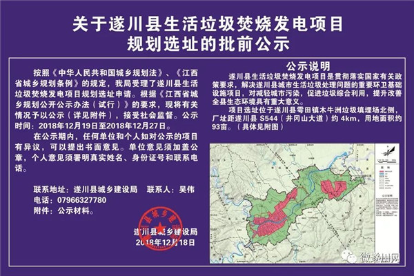 日前遂川縣人民政府發(fā)布了《關于遂川縣生活垃圾焚燒發(fā)電項目規(guī)劃選址的批前公示》,公司現實遂川縣生活垃圾焚燒發(fā)電項目選址位于遂川縣雩田鎮(zhèn)木牛洲垃圾填埋場北側,廠址距遂川縣S544(井岡山大道)約4km,用地面積約93畝。具體公司內容如下: