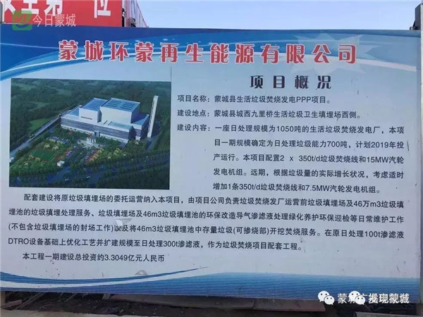 最新消息!安徽蒙城縣生活垃圾焚燒發(fā)電項目將于明年7月開始垃圾焚燒調試,明年年底正式投入使用。蒙城縣生活垃圾焚燒發(fā)電PPP項目于2017年9月12日簽署PP協(xié)議。項目總投資為33049萬元。項目占地約70畝(一期工程),項目建設于2018年4月28日開工。項目主要建設內容為一座日處理1050噸的生活垃...