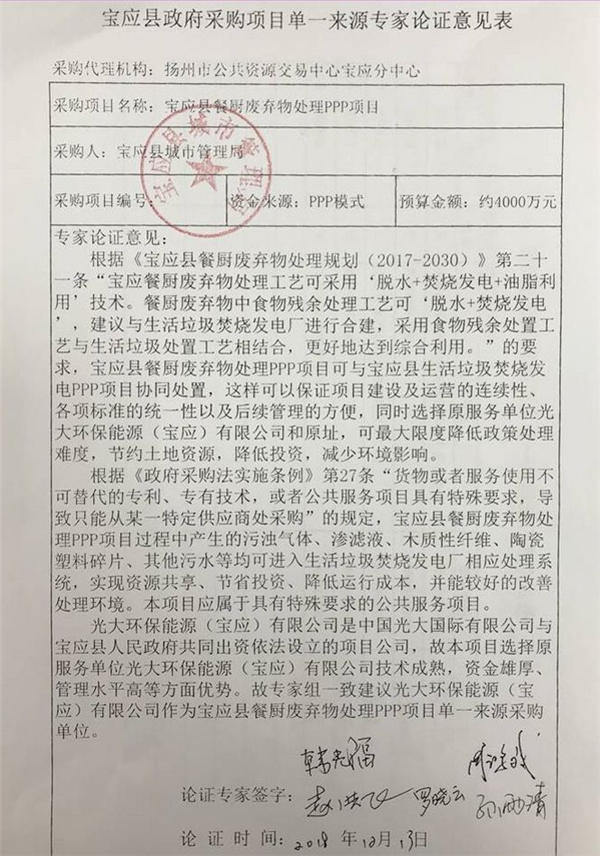 揚州市公共資源交易中心寶應分中心受寶應縣城市管理局的委托,就其所需的寶應縣餐廚廢棄物處理PPP項目進行政府采購。根據(jù)本項目的特殊情況及采購人的申請,經(jīng)專家論證對其擬采用的單一來源采購方式,相關內(nèi)容公示如下:1、論證人員名單姓名 工作單位韓光福 住建部可持續(xù)發(fā)展與資源環(huán)境專家委員會孫雨清 蘇州市環(huán)衛(wèi)處...