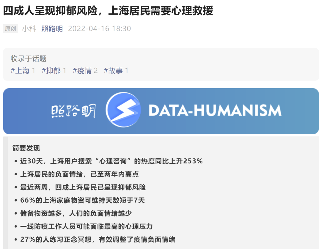 據(jù)心理領(lǐng)域的公眾號“照路明”,說現(xiàn)在上海疫情嚴(yán)重,大家隔離短的已經(jīng)半個多月,長的一個多月,近四成上海人呈現(xiàn)抑郁風(fēng)險,需要救援。 圖片來自網(wǎng)絡(luò) 其實,這些心理救援是非常重要的。每個人碰到這種百年不遇的疫情和居家隔離,都會出現(xiàn)或多或少的心理問題。如果能打通心理咨詢熱線最好,可以聽聽專業(yè)人士的輔導(dǎo)。如果搶...