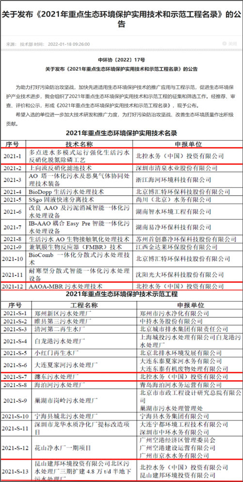 近日,中國(guó)環(huán)境保護(hù)產(chǎn)業(yè)協(xié)會(huì)公布了《2021年重點(diǎn)生態(tài)環(huán)境保護(hù)實(shí)用技術(shù)和示范工程名錄》, 北控水務(wù)申報(bào)的兩項(xiàng)技術(shù)、兩項(xiàng)工程成功上榜,分別入選“實(shí)用技術(shù)名錄”及“示范工程名錄”,彰顯了北控水務(wù)專業(yè)的技術(shù)能力和運(yùn)營(yíng)實(shí)力。 兩項(xiàng)實(shí)用技術(shù)上榜 技術(shù)專業(yè)創(chuàng)新能力獲...
