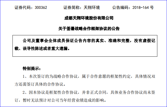 2018年12月24日,天翔環(huán)境公告稱,公司與四川能投水務(wù)投資有限公司在12月21日已經(jīng)正式簽訂了《戰(zhàn)略合作框架協(xié)議》。此次戰(zhàn)略合作協(xié)議的簽訂,意味著陷入債務(wù)泥淖的天翔環(huán)境,再次迎來又一家地方國資的的“馳援”。 根據(jù)協(xié)議內(nèi)容,雙方擬在本協(xié)議正式簽署后組建專業(yè)團隊,對所涉及合作...