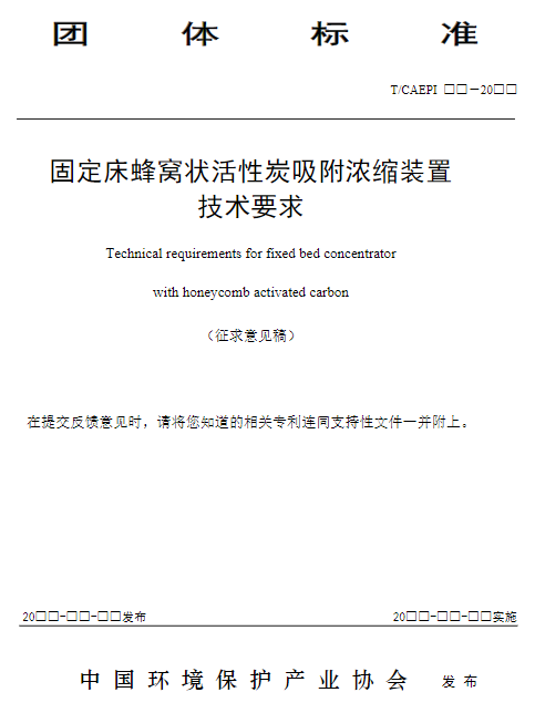 各有關(guān)單位: 為促進(jìn)固定床蜂窩狀活性炭吸附技術(shù)發(fā)展,規(guī)范固定床蜂窩狀活性炭吸附濃縮裝置的制造使用,我會(huì)下達(dá)編制中國(guó)環(huán)境保護(hù)產(chǎn)業(yè)協(xié)會(huì)標(biāo)準(zhǔn)《固定床蜂窩狀活性炭吸附濃縮裝置技術(shù)要求》。目前,標(biāo)準(zhǔn)編制單位已完成標(biāo)準(zhǔn)的征求意見(jiàn)稿。根據(jù)《中國(guó)環(huán)境保護(hù)產(chǎn)業(yè)協(xié)會(huì)標(biāo)準(zhǔn)管理辦法》的規(guī)定,現(xiàn)將該標(biāo)準(zhǔn)征求意見(jiàn)稿和有關(guān)材料印...