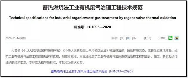 2020年1月14日,生態(tài)環(huán)境部發(fā)布了一個重磅的行業(yè)技術(shù)規(guī)范,即批準(zhǔn)《蓄熱燃燒法工業(yè)有機(jī)廢氣治理工程技術(shù)規(guī)范》為國家環(huán)境保護(hù)標(biāo)準(zhǔn),并予發(fā)布,標(biāo)準(zhǔn)編號為HJ1093-2020。 該標(biāo)準(zhǔn)與《揮發(fā)性有機(jī)物污染防治技術(shù)政策》、《吸附法工業(yè)有機(jī)廢氣治理工程技術(shù)規(guī)范》、《催化燃燒法工業(yè)有機(jī)廢氣治理工程技術(shù)規(guī)范》...