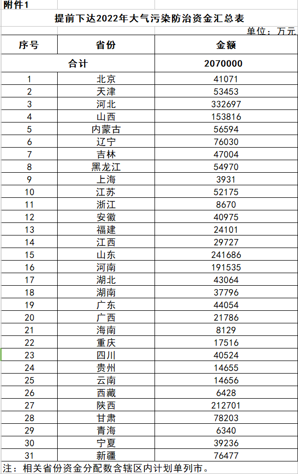 財政部關(guān)于提前下達2022年大氣污染防治資金預(yù)算的通知 財資環(huán)〔2021〕114號 各省、自治區(qū)、直轄市財政廳(局): 為支持大氣污染防治工作,促進大氣質(zhì)量改善,現(xiàn)下達你省(自治區(qū)、直轄市,以下簡稱省)2022年大氣污染防治資金,用于支持開展減污降碳等方面相關(guān)工作,并就有關(guān)事項通知如下: 一、各省安...