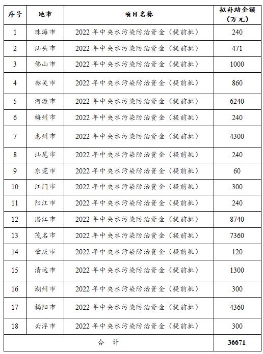 廣東省生態(tài)環(huán)境廳關(guān)于2022年中央水污染防治資金(提前批)、大氣污染防治資金(提前批)安排計劃的公示 經(jīng)廳黨組會議、廳務(wù)會議審議通過,我廳擬申請?zhí)崆跋逻_2022年中央水污染防治資金36671萬元、大氣污染防治資金44054萬元。 按照《廣東省省級財政專項資金管理辦法(試行)》(粵府〔2018〕120...