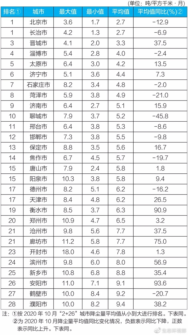 生態(tài)環(huán)境部公布10月京津冀“2+26”城市和汾渭平原11城市降塵監(jiān)測(cè)結(jié)果