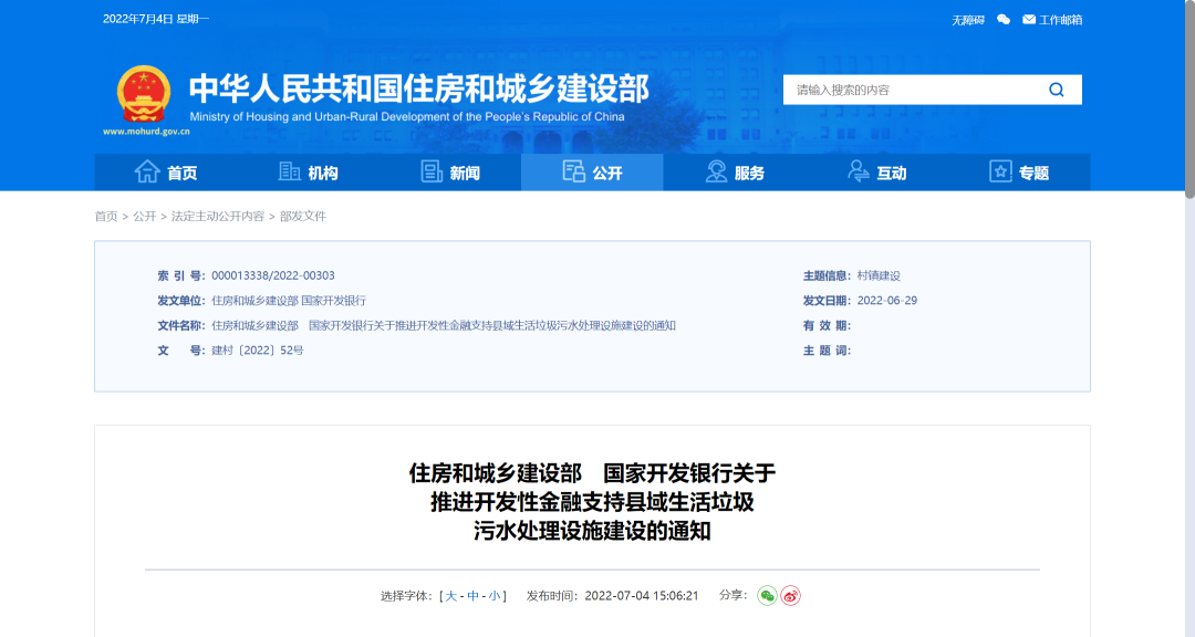 縣域生活垃圾污水處理設(shè)施建設(shè)“錢”的問題,終于有了解決方案。 7月4日,住房和城鄉(xiāng)建設(shè)部、國(guó)家開發(fā)銀行聯(lián)合發(fā)布《關(guān)于推進(jìn)開發(fā)性金融支持縣域生活垃圾污水處理設(shè)施建設(shè)的通知》(下稱《通知》),對(duì)縣域生活垃圾污水處理設(shè)施建設(shè)給出金融支持。 具體來講,未來如果是納入項(xiàng)目?jī)?chǔ)備庫的項(xiàng)目,...