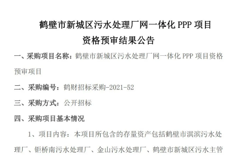 6.1億!中節(jié)能國禎、城發(fā)環(huán)境等三家入圍鶴壁污水廠網(wǎng)一體化PPP項目