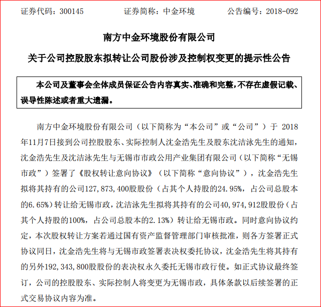 中金環(huán)境公告,公司控股股東、實際控制人沈金浩及股東沈潔泳與無錫市市政公用產(chǎn)業(yè)集團有限公司(以下簡稱“無錫市政”)簽署《股權(quán)轉(zhuǎn)讓意向協(xié)議》。 沈金浩擬將其持有的公司127,873,400股股份(占其個人持股的24.95%,占公司總股本的6.65%)轉(zhuǎn)讓給無錫市政,沈潔泳擬將其持...