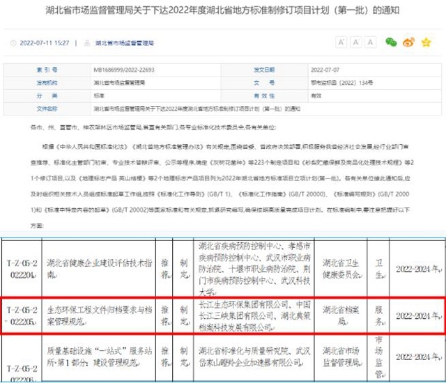 近日,湖北省市場監(jiān)督管理局印發(fā)關于下達2022年度湖北省地方標準制修訂項目計劃(第一批)的通知,長江環(huán)保集團牽頭主編的《生態(tài)環(huán)保工程文件歸檔要求與檔案管理規(guī)范》成功入選2022年湖北省地方標準項目立項計劃(第一批),這是公司成立以來首次牽頭主編的省級地方標準?!逗笔∈袌霰O(jiān)督管理局關于下達2022年...