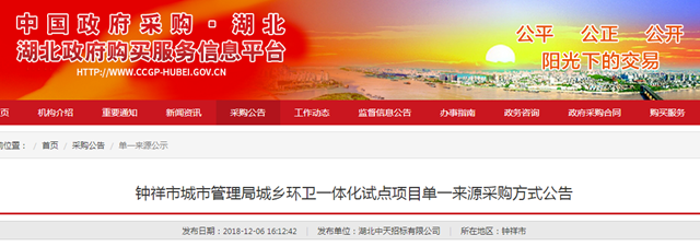 2018年12月6日,湖北省鐘祥市城鄉(xiāng)環(huán)衛(wèi)一體化試點(diǎn)項(xiàng)目發(fā)布單一來(lái)源采購(gòu)方式公告,擬選擇單一來(lái)源供應(yīng)商為中國(guó)光大生態(tài)資源(香港)有限公司,項(xiàng)目預(yù)算2262萬(wàn)/年。 據(jù)悉,項(xiàng)目的服務(wù)范圍以鐘祥市所轄的5個(gè)鄉(xiāng)鎮(zhèn)為試點(diǎn)(包括:舊口鎮(zhèn)、柴湖鎮(zhèn)、長(zhǎng)灘鎮(zhèn)、九里鄉(xiāng)、東橋鎮(zhèn))共計(jì)147個(gè)行政村,主要內(nèi)容包括農(nóng)村鎮(zhèn)區(qū)...