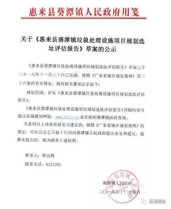 日前廣東揭陽(yáng)惠來(lái)縣葵潭鎮(zhèn)政府發(fā)布了關(guān)于《惠來(lái)縣葵潭鎮(zhèn)垃圾處理設(shè)施項(xiàng)目規(guī)劃選址評(píng)估報(bào)告》草案的公示,具體內(nèi)容如下:原標(biāo)題:關(guān)于《惠來(lái)縣葵潭鎮(zhèn)垃圾處理設(shè)施項(xiàng)目規(guī)劃選址評(píng)估報(bào)告》草案的公示
