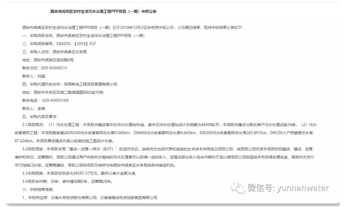 2018年12月10日,陜西省政府采購(gòu)網(wǎng)對(duì)“西安市閻良區(qū)農(nóng)村生活污水治理工程PPP項(xiàng)目(一期)”中標(biāo)作公告,云南水務(wù)聯(lián)同云南省建設(shè)投資控股集團(tuán)有限公司成功中標(biāo)。 該項(xiàng)目以PPP模式運(yùn)作,將建設(shè)污水處理工程和污水收集管網(wǎng)工程,總投資約4億元。項(xiàng)目合作期限為30年,其中建設(shè)期2年...