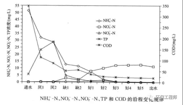 本文通過一張AAO系統(tǒng)內(nèi)污染物的變化曲線針對每個段的的水質(zhì)情況進行數(shù)據(jù)進行分析,了解完這個就可以快速知道自己系統(tǒng)的問題,其中,各個單元均是取樣沉淀后,測定的上清液濃度。 1、AAO系統(tǒng)全流程的COD變化 從曲線中看出:進水COD350mg/l左右,厭氧1段:100mg/l左右,厭氧2段:75左右,缺...