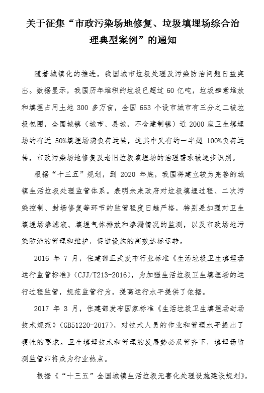 關(guān)于征集“市政污染場地修復(fù)、垃圾填埋場綜合治理典型案例”的通知