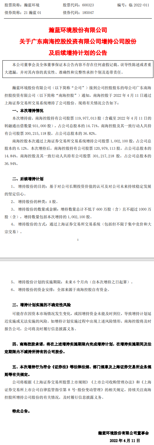 2022年4月11日,瀚藍(lán)環(huán)境股份有限公司(下稱“瀚藍(lán)環(huán)境”)發(fā)布公告稱,廣東南??毓赏顿Y有限公司(下稱“南??毓?rdquo;)已成功通過上海證券交易所交易系統(tǒng)增持了股份。 據(jù)了解,本次增持前,南??毓沙钟绣{(lán)環(huán)境14.71%的股份,及其一致行動(dòng)人共持有瀚藍(lán)環(huán)境...